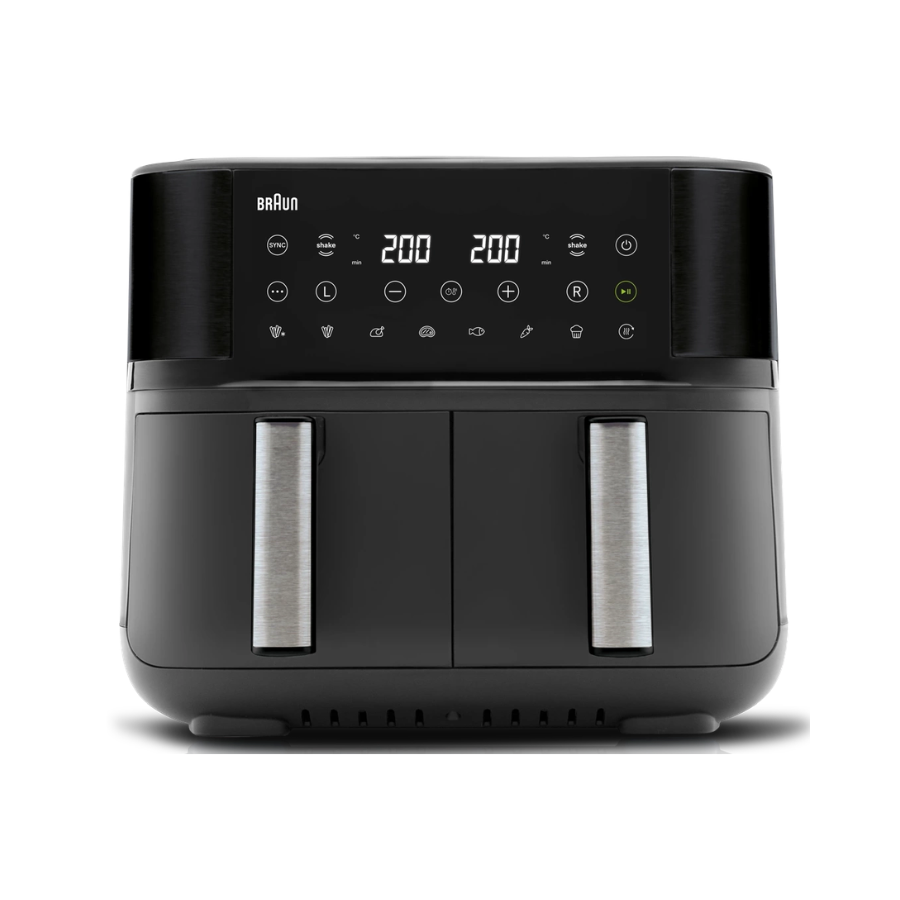 the Braun Air Fryer with an 8L capacity . It features two cooking baskets with