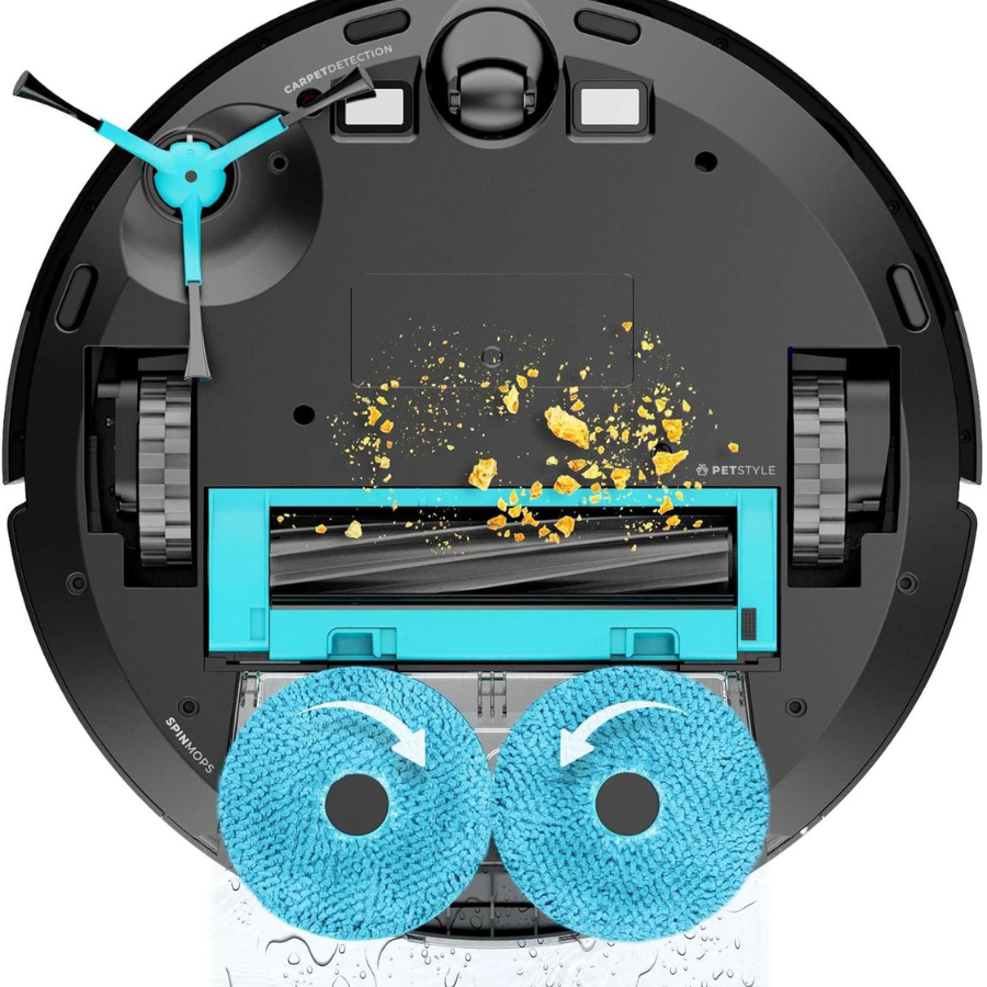 ultra-power suction, silicone anti-tangle brush, and dual rotating mops make it