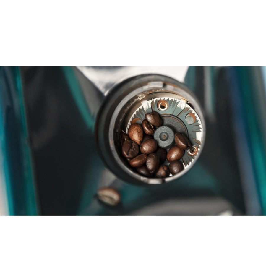 Powered by 150 W, it uses a flat-grindstone system to preserve the full aroma