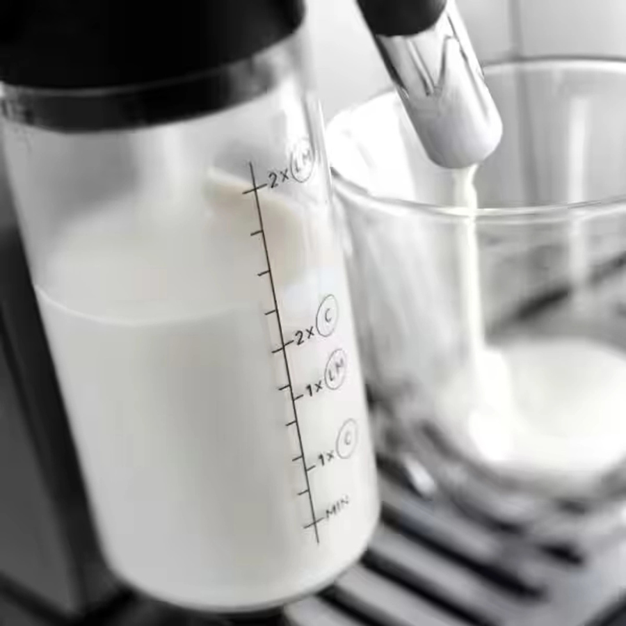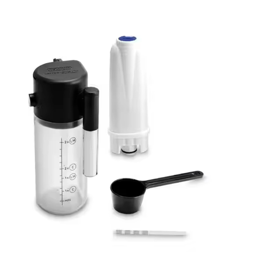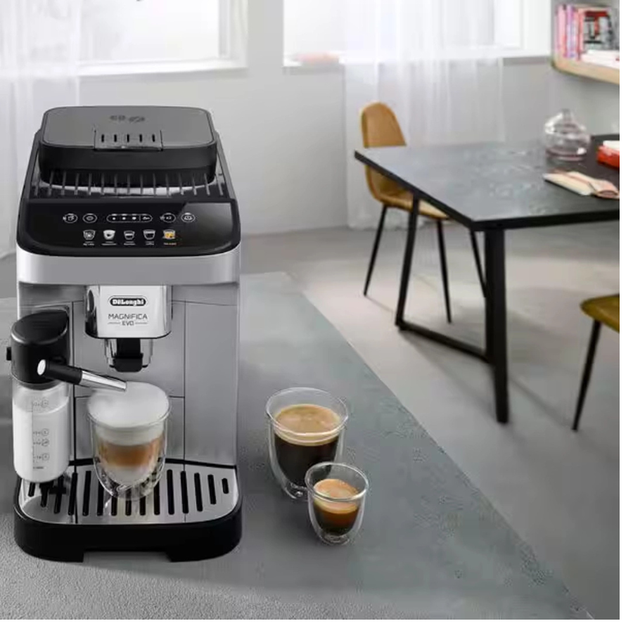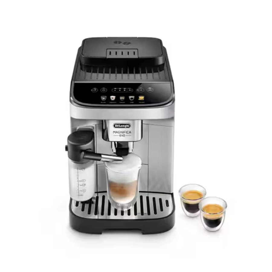 Delonghi Espresso Machine with a 15-bar pump, 250g bean container, and 1.8L water tank. It brews espresso, coffee, and milk-based drinks like cappuccinos with LatteCrema technology. Features twin-shot brewing, aroma control, programmable water hardness, and compatibility with pre-ground coffee and water filters. Sleek design in Silver Black with a stainless-steel cup holder.