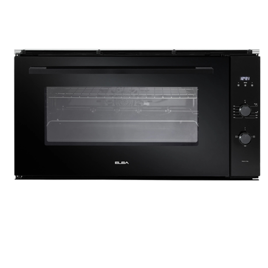 Elba 90 cm built-in gas oven with a sleek design and practical performance for all cooking needs. Features gas cooking with a fan for even heat distribution and a gas grill for perfect grilling results. Equipped with full safety, a fan cooking function, a timer display, and touch controls for easy start and end of cooking programs. Includes a rotisserie, double-glass removable door, cooling fan, and internal light. Accessories: Electric chicken rotisserie, one baking tray, and a specially designed rack. Dimensions: Height 478 mm, Width 896 mm.