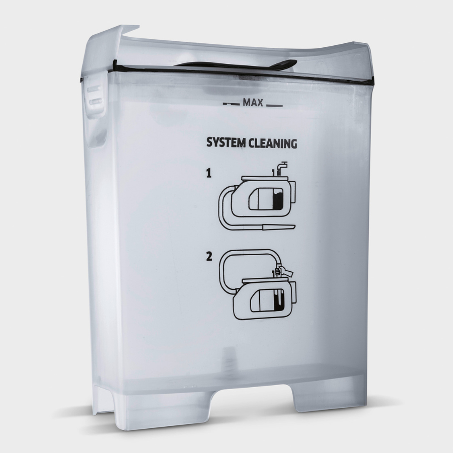 It comes with a 1.7L clean water tank and a 2.9L dirty water tank for hygienic