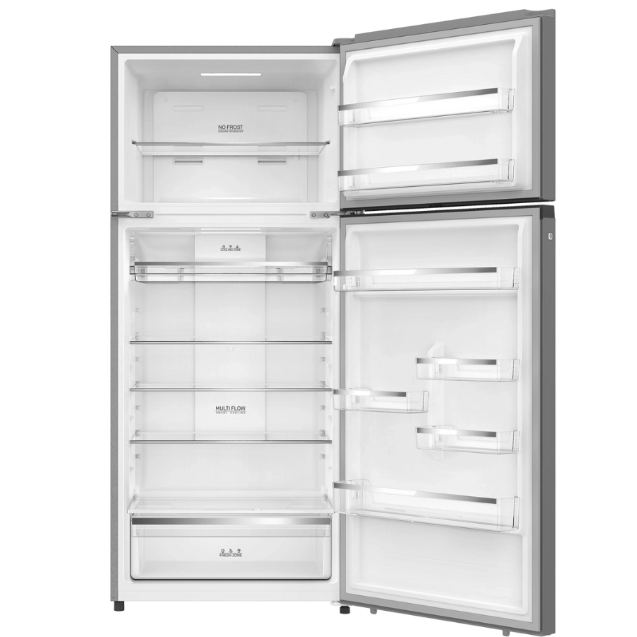 Enjoy efficient storage and powerful cooling with the Skyworth 512L refrigerator featuring a practical top freezer design. It includes Total No Frost technology to prevent ice build-up and maintain freshness longer, with an energy-efficient A++ rating. The stylish dark inox finish, reversible door, and adjustable legs fit any kitchen space. LED interior lighting and optional handle and lock provide added convenience.