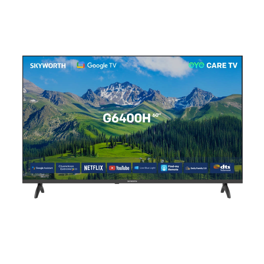 The Skyworth 60-inch Smart TV with 4K resolution delivers an immersive viewing experience. It features Game Mode, a 60Hz refresh rate, and voice search via the remote. Powered by a Quad-Core processor for smooth performance and quick response.