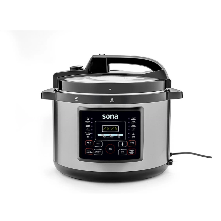 Experience fast and safe cooking with the Sona Electric Pressure Cooker, featuring 1500W power and a 10-liter capacity. It is equipped with 14 diverse cooking programs and a keep-warm function, along with the ability to pre-set cooking time, pressure, and temperature for perfect results. The cooker includes a non-stick ceramic inner pot (830g), an air release valve, and an advanced safety system with overpressure and overheating protection. Accessories include a measuring cup, spoon, extra sealing ring, and stainless steel steam sieve, making it the ideal choice for quick and healthy cooking!