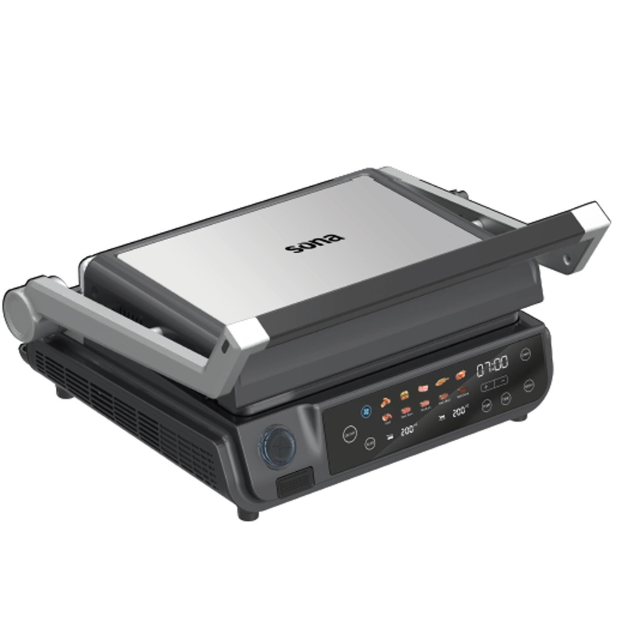 Enjoy the perfect grilling experience with the 2000W Sona Grill, featuring 6 cooking programs, a digital touch control panel, and 95% smoke reduction. Reversible and detachable plates, along with a filtration system, ensure healthy cooking and easy cleaning.